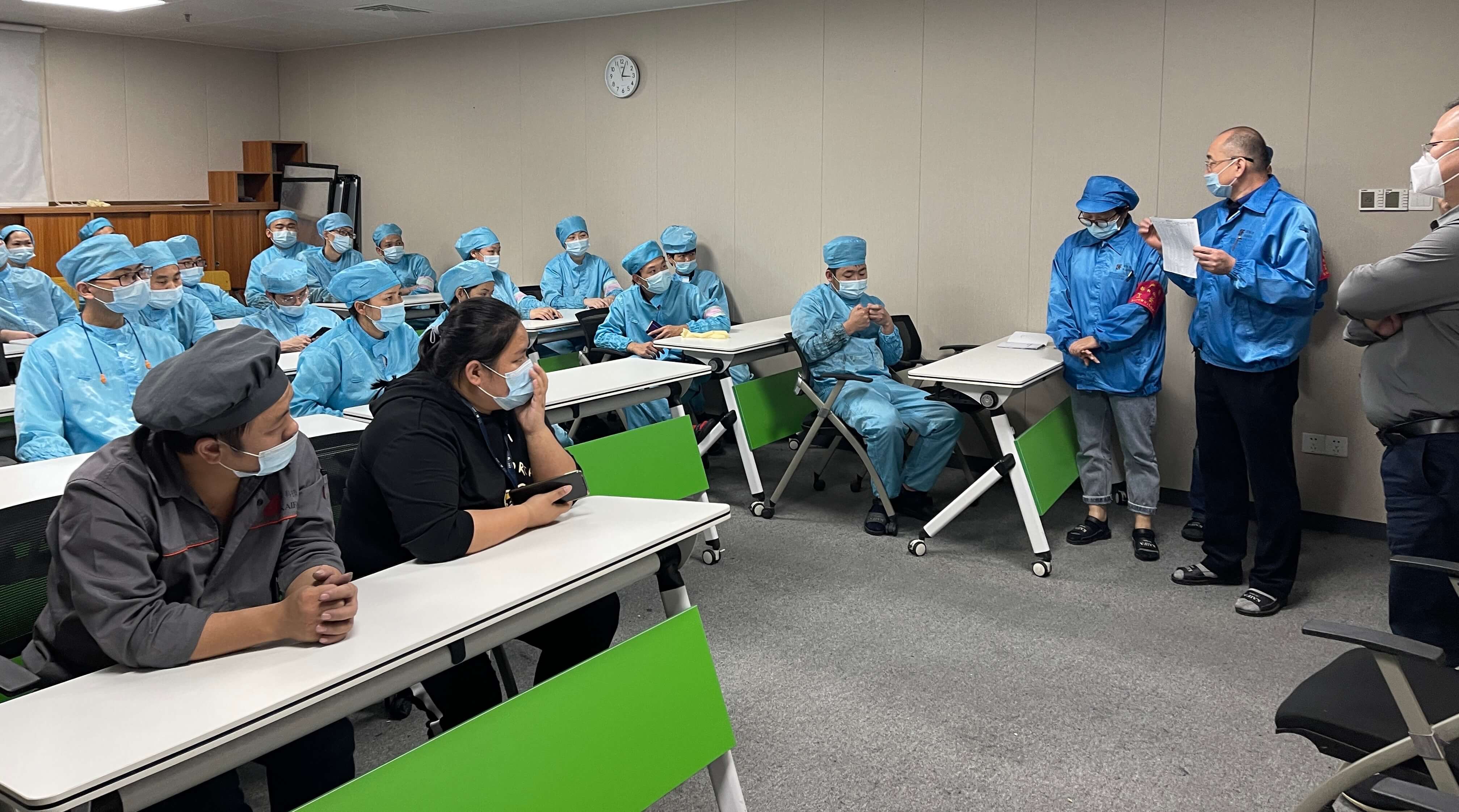 領導干部沖在前線。精密公司全力配合指揮部工作,總經理曾衛以身作則坐鎮一線指揮,吃住都在園區,帶領全體員工做好疫情防控及安全生產工作,率管理層下潛生產一線保產能。事業部總經理、BU負責人,工程、制造高級經理,工藝、設備經理,全部工程師、主管以及計劃部員工、IQA、QMD、HR&A員工都放下手頭的工作,穿上車間工作服,挺身而出站到產線各個普通崗位上。他們自帶鋪蓋,吃住行均在工廠,與產線員工一起保生產、保產出。為了讓產線員工有更好的休息環境,他們住在辦公室,騰出宿舍供奮戰在生產一線的員工。